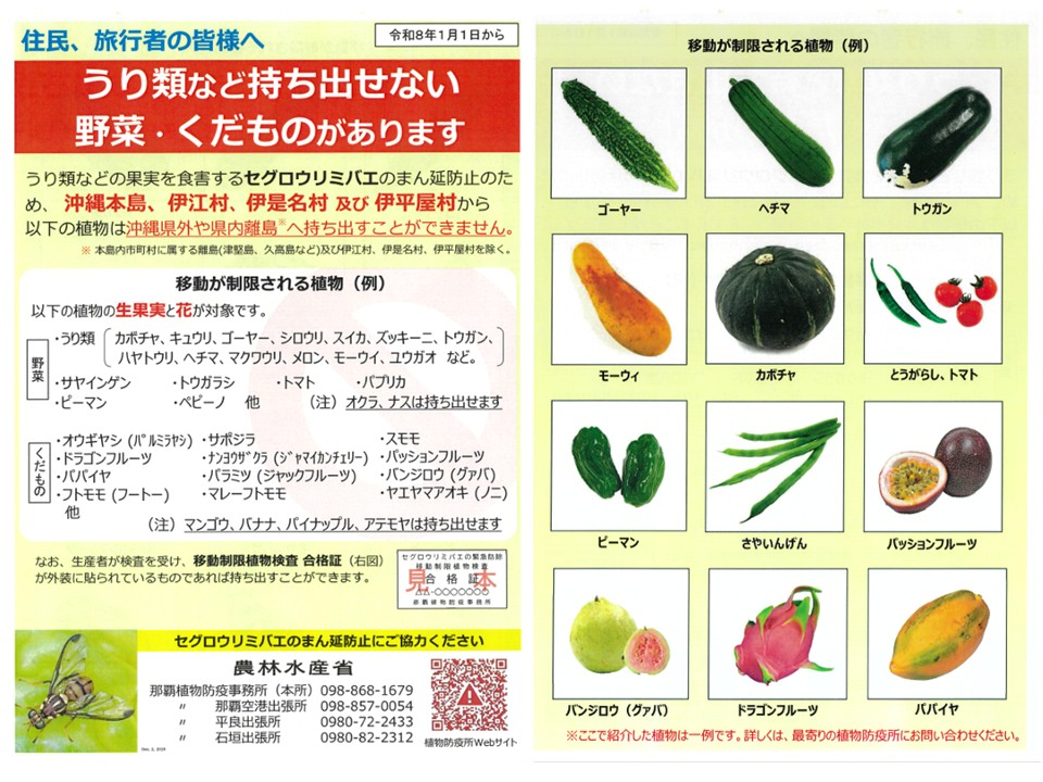 植物等の移動規制に関する広報強化週間 2025/12/11 お知らせ 沖縄県、奄美群島、トカラ列島及び小笠原諸島から本土に持ち込みが規制されている植物等があります。 農林水産省植物防疫所では、サツマイモなどの農作物に大きな被害を与える病害虫が発生している地域からこれらの病害虫やその病害虫が付着するおそれのある植物等が持ち出されないように、また、未発生地域においては、これらが持ち込まれることのないように、空港や港において広報活動・取締りを行っています。 病害虫のまん延防止のため、皆様のご理解とご協力をお願いいたします。